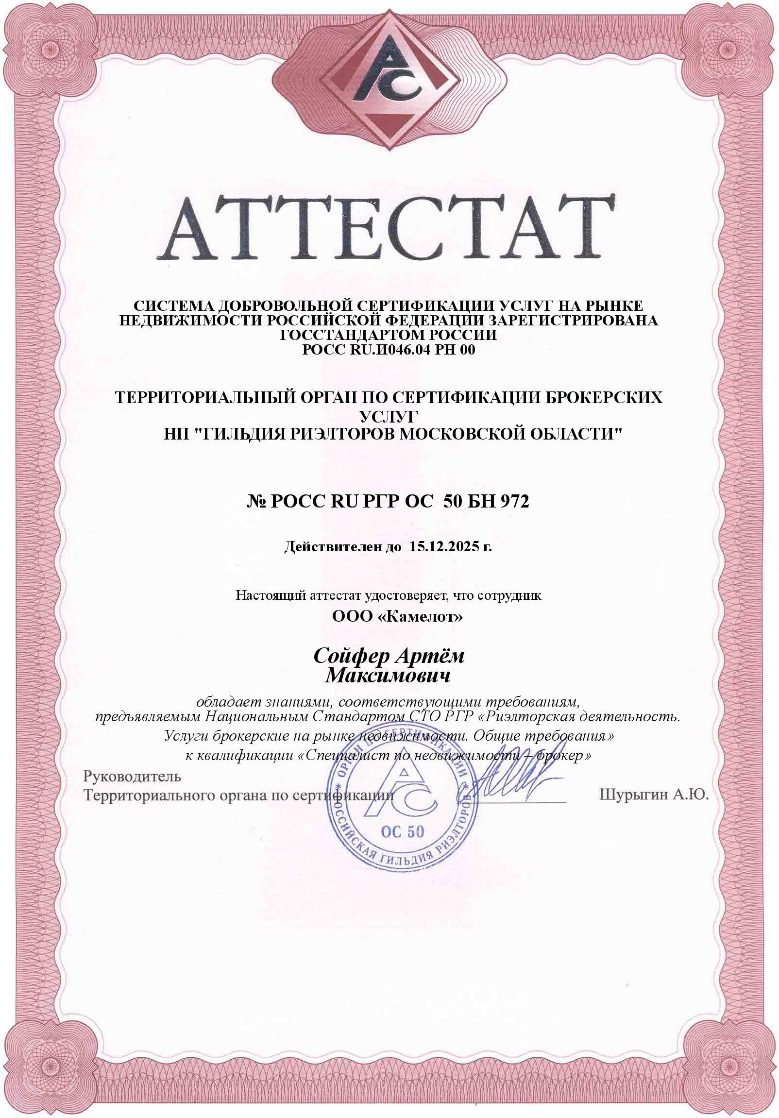 Здравствуйте, меня зовут Сойфер Артём! Я сертифицированный специалист по работе с недвижимостью, а так же партнер агентства недвижимости "Камелот", в городе Подольск Московской области. Занимаюсь профессиональной деятельностью с 2009 года. За годы моей работы мне удалось собрать огромный багаж знаний и практики в данной профессии, что позволило сформировать собственный почерк присутствующий в каждой сделке: